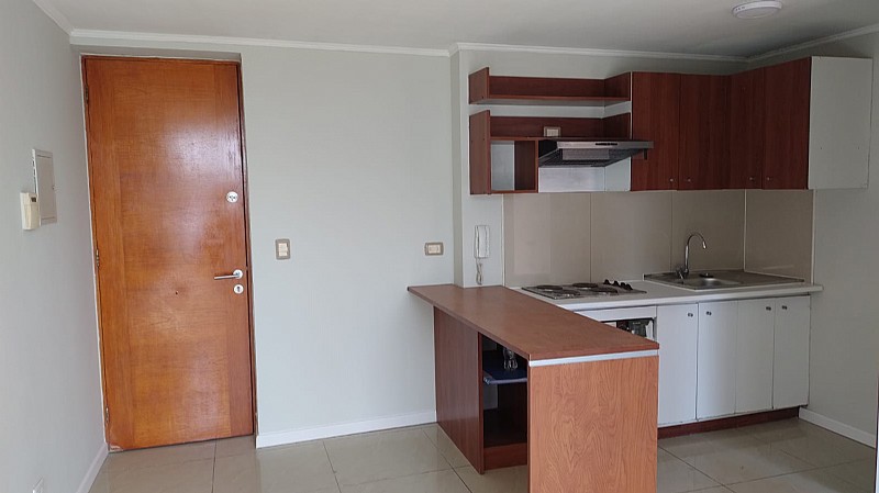 Adicionalmente, cuenta con cocina americana, que incluye cocina eléctrica de cuatro platos, horno eléctrico, mesón comedor y muebles a piso y colgantes. Posee también ambiente para living cómodo y terraza de 2 mts. cuadrados, con vista hacia la cordillera.